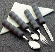 These stainless steel utensils are mounted on plastic stems and sealed into light grey foam handles, to give help for those with weak or painful grip. The foam is comfortable to hold and washable. Diameter 28mm (1 1/4"). Handle length 115mm (4 1/2").