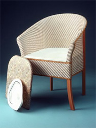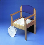 A traditionnal wooden frame commode chair with woven fibre upholstery in white and gold. The removable seat conceals a plastic commode pan and lid with carrying handle. (This is also available separately, see AA2384). The high chair provide support to the patient when rising. Dimensions 775 x 600 x 520mm Commode (including Pan) Max. user weight 160kg / 25st.